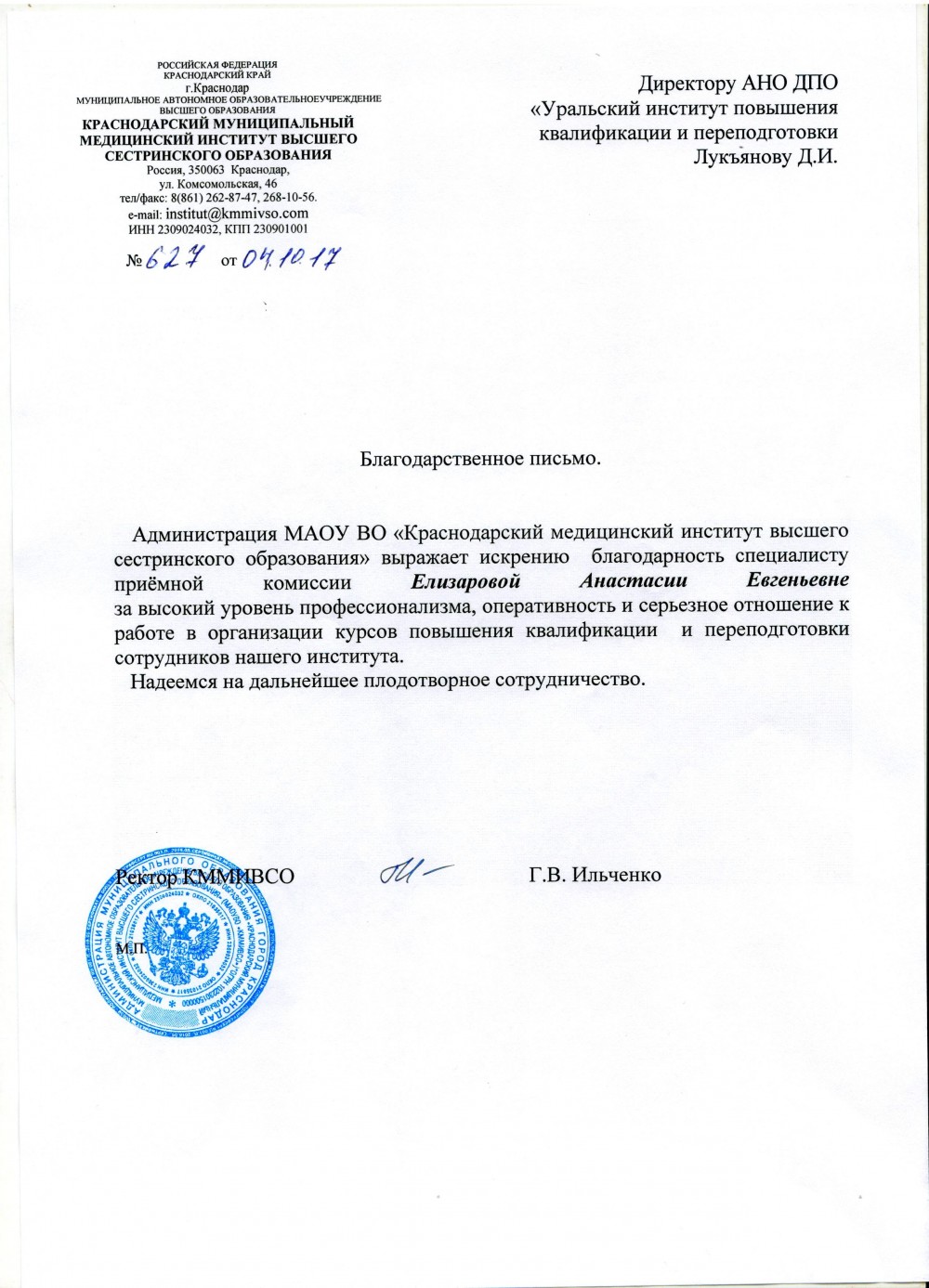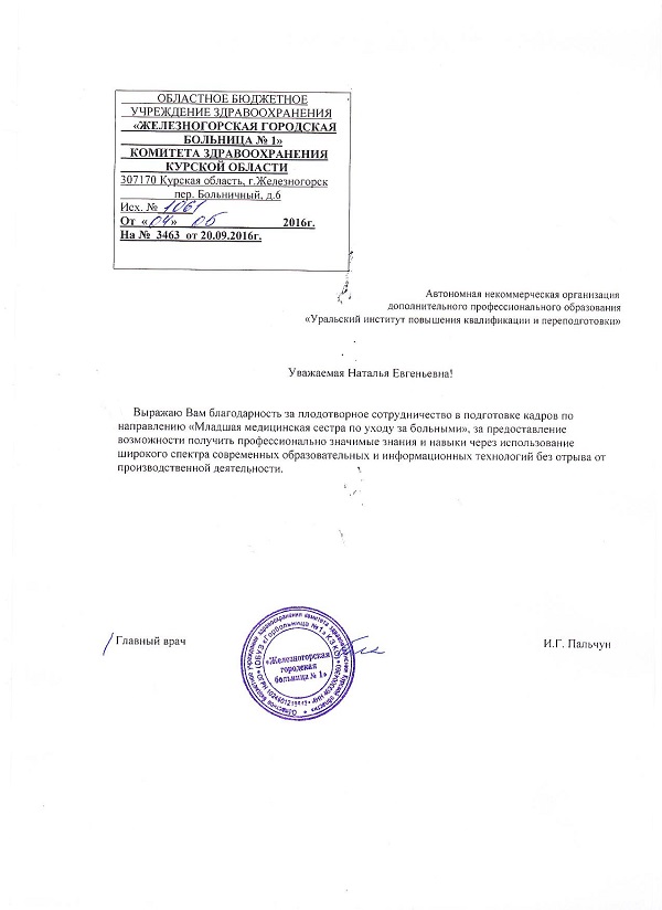 Доброго времени суток.Я прошла обучение в Уральском институте повышения квалификации и переподготовки по специальности «Психологическое консультирование и психодиагностика». Хочу выразить благодарность всем моим преподавателям: Коломейцевой Лидии Владимировне, Перевязко Елене Александровне, Матюшкиной Елене Яковлевне, Мешковой Екатерине Алексеевне, Полуэктовой Ольге Геннадьевне, Ждановой Ирине Михайловне, Богдановой Наталье Александровне, Расуловой Екатерине Владимировне, Русаковой Наталии Васильевне за прекрасно поданный материал, который очень хорошо и понятно усваивался, за отзывы по практическим заданиям, за оперативность, чуткость и благожелательность. Также хочу выразить благодарность техническому и учебному отделу по сопровождению на всём пути обучения. Как только у меня возникал вопрос и я звонила в любой из отделов, всегда тут же мне очень доброжелательно, участливо отвечали сотрудники и я чувствовала, что моим обучением заинтересованы и действительно хотят помочь. И я всегда получала ответ и помощь в любое время.Благодаря всем этим составляющим процесс обучения для был очень приятным, удобным, интересным.А также мне очень понравилось, что было много живых вебинаров по разным дисциплинам и темам. Я выбирала те , которые мне интересны и с удовольствием и пользой для себя участвовала в вебинарах и получила Сертификаты о том, что прослушала и на какую тему. Те вебинары, в которых я не могла участвовать , могла посмотреть в библиотеке уже в записи.Это тоже очень удобно. Обучение было комфортным, качественным и мне очень понравилось, так как могла проходить его в удобном для себя графике. Знания даются качественно и только от себя самого зависит чему и как ты научишься. Благодарю!!!