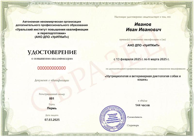 Курс обучения Нутрициология и ветеринарная диетология собак и кошек (144ч)