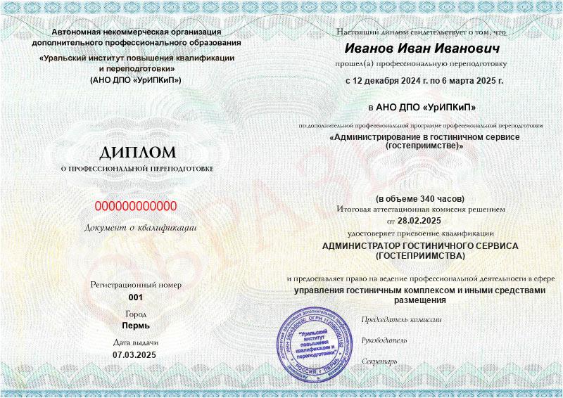 • Квалификация: Администратор гостиничного сервиса (гостеприимства)