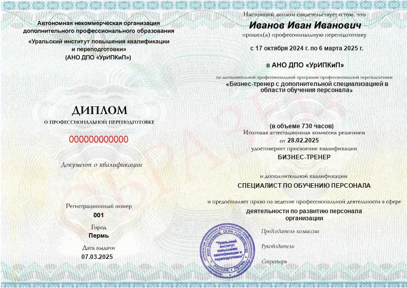 - Образец диплома о профессиональной переподготовке.