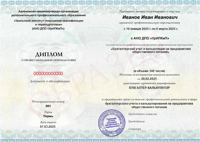 Курс обучения Бухгалтерский учет и калькуляция на предприятиях общественного питания (340ч)