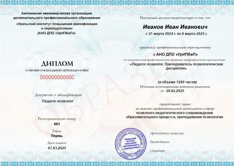 - Образец диплома о профессиональной переподготовке.