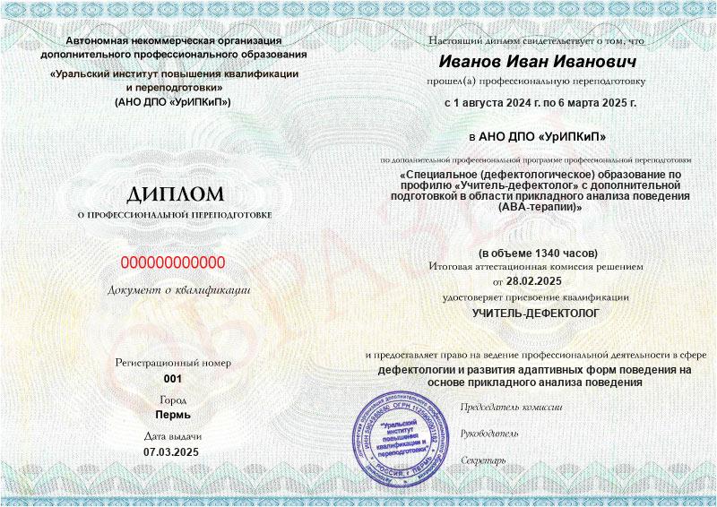 Специальное (дефектологическое) образование по профилю «Учитель-дефектолог» с дополнительной подготовкой в области прикладного анализа поведения (АВА-терапии) (1340ч)